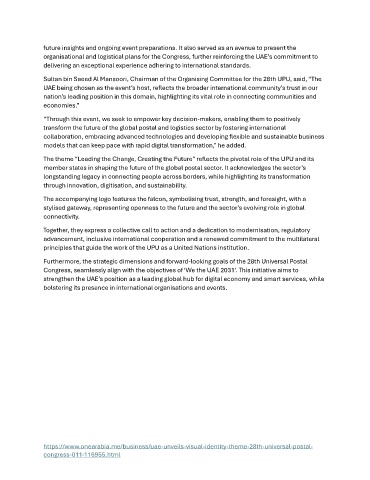 Sultan bin Saeed Al Mansoori, Chairman of the Organising Committee for the 28th UPU, said, “The