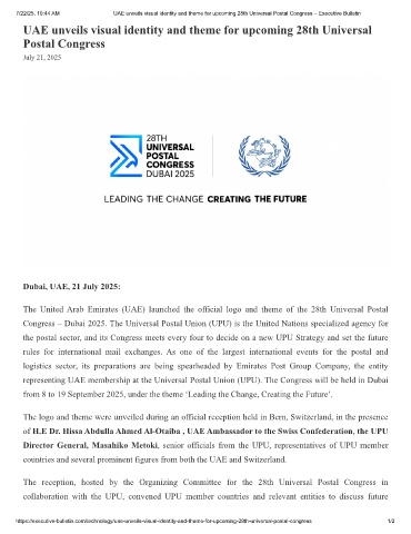 7/22/25, 10:44 AM UAE unveils visual identity and theme for upcoming 28th Universal Postal Congress – Executive Bulletin