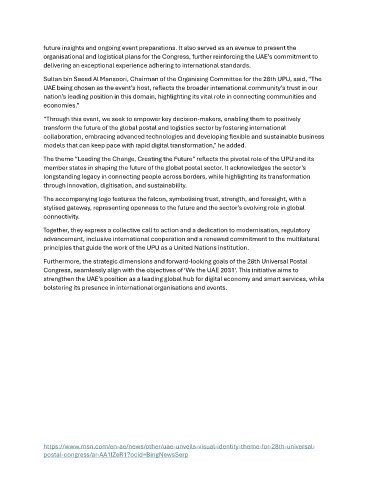 Sultan bin Saeed Al Mansoori, Chairman of the Organising Committee for the 28th UPU, said, “The