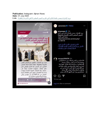 Publication: Instagram- Ajman News Date: 31 July 2025 Link: ةلوفطلاو ةموملأل ىلعلأا سلجملا سيسأت ىركذ يف ًايراكذت ًاعباط ردصي تاراملإا ديرب