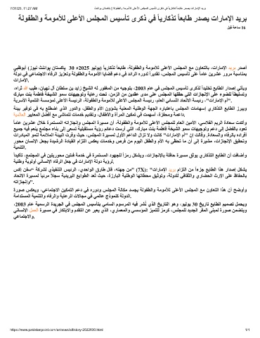 ﺔﻟﻮﻔﻄﻟاو ﺔﻣﻮﻣﻸﻟ ﻰﻠﻋﻷا ﺲﻠﺠﻤﻟا ﺲﯿﺳﺄﺗ ىﺮﻛذ ﻲﻓ ًﺎﯾرﺎﻛﺬﺗ ًﺎﻌﺑﺎط رﺪﺼﯾ تارﺎﻣﻹا ﺪﯾﺮﺑ