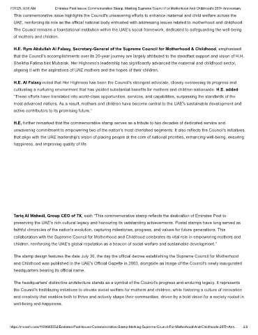 7/31/25, 9:56 AM Emirates Post Issues Commemorative Stamp, Marking Supreme Council For Motherhood And Childhood's 20Th Anniversary