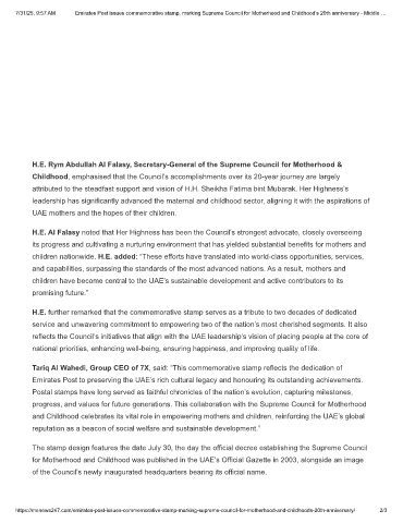 7/31/25, 9:57 AM Emirates Post issues commemorative stamp, marking Supreme Council for Motherhood and Childhood’s 20th anniversary - Middle …