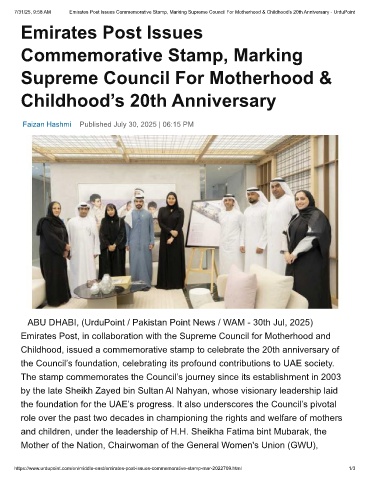 7/31/25, 9:58 AM Emirates Post Issues Commemorative Stamp, Marking Supreme Council For Motherhood & Childhood’s 20th Anniversary - UrduPoint