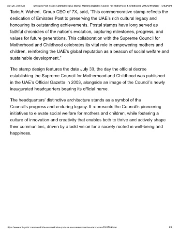 7/31/25, 9:58 AM Emirates Post Issues Commemorative Stamp, Marking Supreme Council For Motherhood & Childhood’s 20th Anniversary - UrduPoint