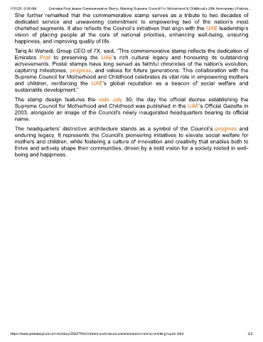 7/31/25, 9:58 AM Emirates Post Issues Commemorative Stamp, Marking Supreme Council For Motherhood & Childhood’s 20th Anniversary | Pakista…