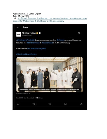 Publication: X- Al Etihad English Date: 31 July 2025 Link: Al Etihad: Emirates Post issues commemorative stamp, marking Supreme Council for Motherhood & Childhood’s 20th anniversary