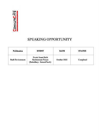 SPEAKING OPPORTUNITY Publication EVENT DATE STATUS Event: Smart Built Built Environment Environment Forum October 2025 Completed (Subsidiary: ScreenCheck)