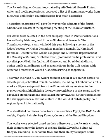 10/14/25, 2:27 PM ALC approves shortlists for Kanz Al Jeel Award