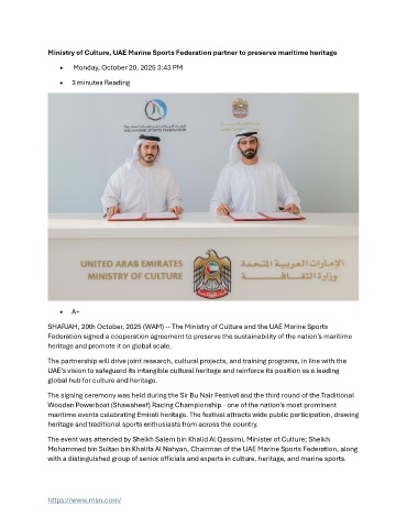 SHARJAH, 20th October, 2025 (WAM) -- The Ministry of Culture and the UAE Marine Sports