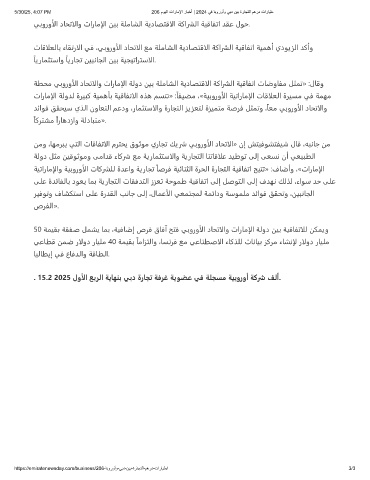 ﺔﻄﺤﻣ ﻲﺑوروألا دﺎﺤﺗالاو تارﺎﻣإلا ﺔﻟود ﻦﻴﺑ ﺔﻠﻣﺎﺸﻟا ﺔﻳدﺎﺼﺘﻗالا ﺔﻛارشﻟا ﺔﻴﻗﺎﻔﺗا تﺎﺿوﺎﻔﻣ ﻞﺜﻤﺗ» :لﺎﻗو