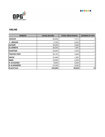WEBSITE VALUE (IN AED) TOTAL MEDIA REACH NUMBER OF HITS