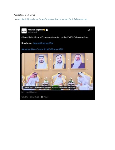 Publication: X – Al Etihad Link: Al Etihad: Ajman Ruler, Crown Prince continue to receive Eid Al Adha greetings