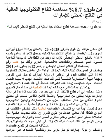 3/5/25, 11:21 AM ٹﻧﺋاوﺑ نﺎﺗﺳﮐﺎﺑ | تارﺎﻣﻺﻟ ﻲﻠﺣﻣﻟا ﺞﺗﺎﻧﻟا ﻲﻓ ﺔﯾﻟﺎﻣﻟا ﺎﯾﺟوﻟوﻧﻛﺗﻟا عﺎطﻗ ﺔﻣھﺎﺳﻣ %8.7 :قوط نﺑا