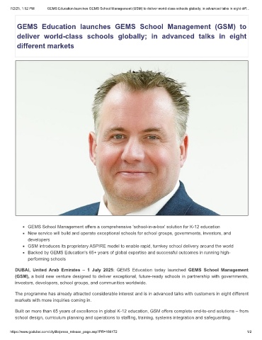 7/2/25, 1:52 PM GEMS Education launches GEMS School Management (GSM) to deliver world-class schools globally; in advanced talks in eight diff…