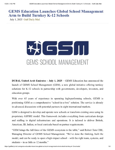 https://gulfdailymail.com/gems-education-launches-global-school-management-arm-to-build-turnkey-k-12-schools/ 1/2