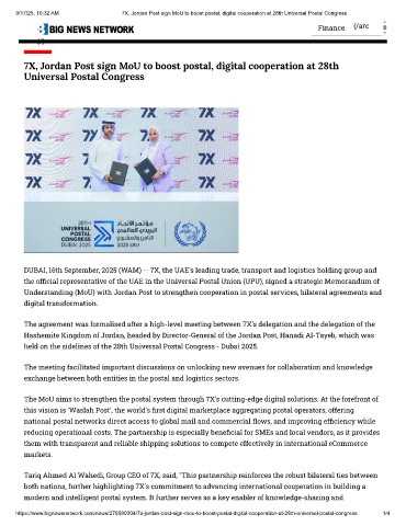 9/17/25, 10:32 AM 7X, Jordan Post sign MoU to boost postal, digital cooperation at 28th Universal Postal Congress