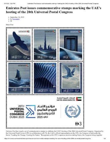 9/11/25, 1:26 PM Emirates Post issues commemorative stamps marking the UAE's hosting of the 28th Universal Postal Congress