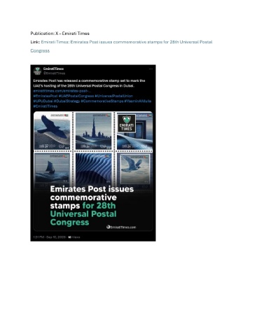 Publication: X – Emirati Times Link: Emirati Times: Emirates Post issues commemorative stamps for 28th Universal Postal Congress