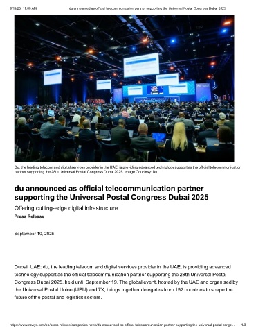 https://www.zawya.com/en/press-release/companies-news/du-announced-as-official-telecommunication-partner-supporting-the-universal-postal-congr… 1/3