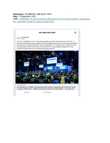 Publication: FACEBOOK- MID EAST INFO Date: 11 September 2025 LINK: - Mid-East: du announced as official telecommunication partner supporting the Universal Postal Congress Dubai 2025