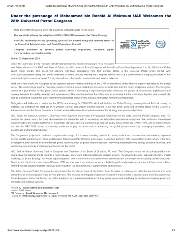 and Prime Minister of the UAE and Ruler of Dubai, the 28th Universal Postal Congress will be held in Dubai from September 8 to 19, 2025 at the Dubai