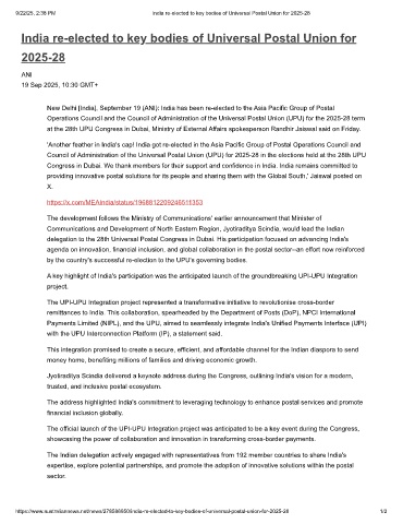 9/22/25, 2:38 PM India re-elected to key bodies of Universal Postal Union for 2025-28