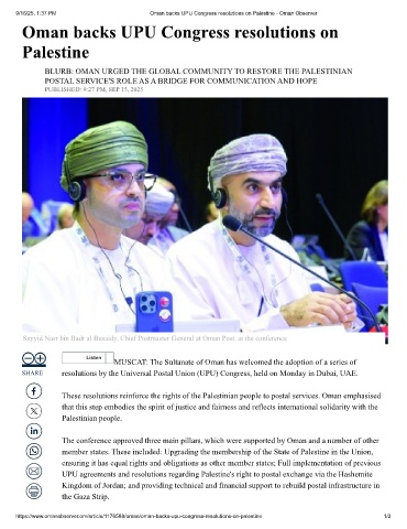 9/16/25, 1:37 PM Oman backs UPU Congress resolutions on Palestine - Oman Observer