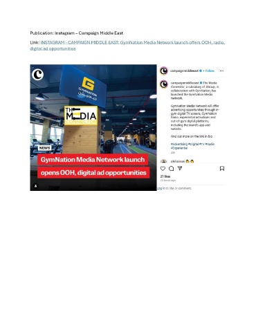 Publication: Instagram – Campaign Middle East Link: INSTAGRAM - CAMPAIGN MIDDLE EAST: GymNation Media Network launch offers OOH, radio, digital ad opportunities
