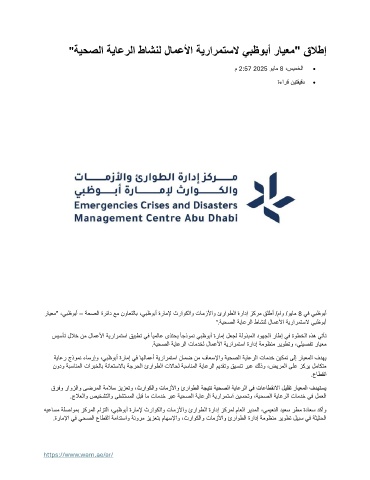 رايعم" ،يبظوبأ – ةحصلا ةرئاد عم نواعتلاب ،يبظوبأ ةراملإ ثراوكلاو تامزلأاو ئراوطلا ةرادإ زكرم قلطأ /ماو /ويام 8 يف يبظوبأ