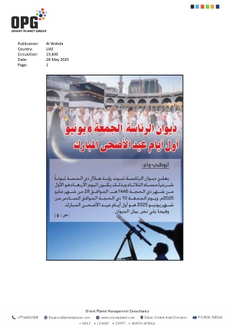 Publication: Al Wahda Country: UAE Circulation: 19,400 Date: 28 May 2025 Page: 1