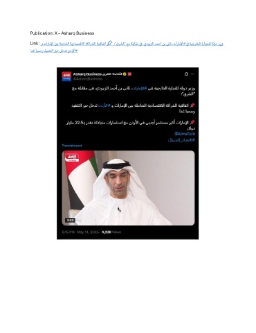 Publication: X – Asharq Business Link: و تاراملإا نيب ةلماشلا ةيداصتقلاا ةكارشلا ةيقافتا :"قرشلا" عم ةلباقم يف ،يدويزلا دمحأ نب يناث ،تاراملإا# يف ةيجراخلا ةراجتلل ةلود ريزو ادغ ايمسر ذيفنتلا زيح لخدت ندرلأا#