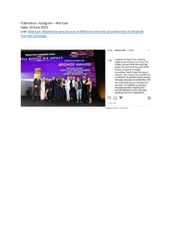 Publication: Instagram – Mid East Date: 10 June 2025 Link: Mid-East: Digimotive wins bronze at MMA Smarties for innovative Ras Al Khaimah Tourism Campaign