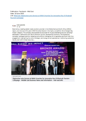 Publication: Facebook – Mid East Date: 10 June 2025 Link: Mid-East: Digimotive wins bronze at MMA Smarties for innovative Ras Al Khaimah Tourism Campaign