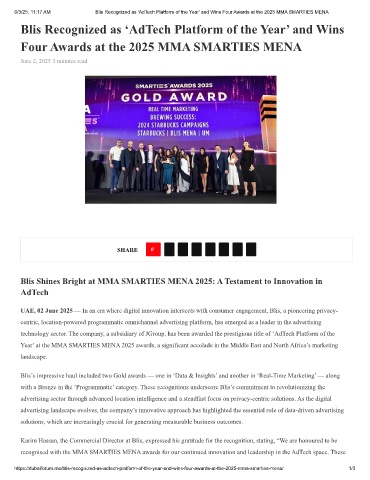 6/3/25, 11:17 AM           Blis Recognized as 'AdTech Platform of the Year' and Wins Four Awards at the 2025 MMA SMARTIES MENA