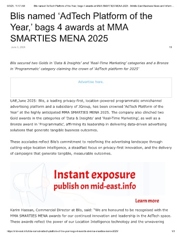 6/3/25, 11:17 AM  Blis named ‘AdTech Platform of the Year,’ bags 4 awards at MMA SMARTIES MENA 2025 - Middle East Business News and Inform…