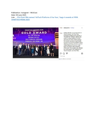 Publication: Instagram – Mid East Date: 03 June 2025 Link: - Mid-East: Blis named ‘AdTech Platform of the Year,’ bags 4 awards at MMA SMARTIES MENA 2025