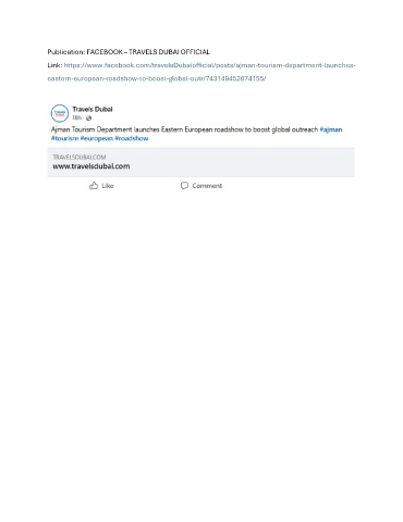 Publication: FACEBOOK – TRAVELS DUBAI OFFICIAL Link: https://www.facebook.com/travelsDubaiofficial/posts/ajman-tourism-department-launches- eastern-european-roadshow-to-boost-global-outr/743149452074155/
