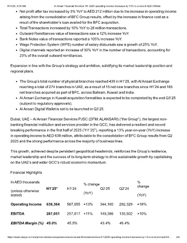 8/14/25, 9:34 AM Al Ansari Financial Services’ H1 2025 operating income increases by 13% to a record AED 638mln