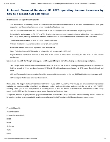 8/14/25, 9:37 AM Al Ansari Financial Services' H1 2025 operating income increases by 13% to a record AED 638 million