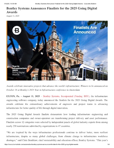 8/12/25, 10:30 AM Bentley Systems Announces Finalists for the 2025 Going Digital Awards – Executive Bulletin