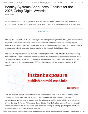 8/12/25, 10:31 AM Bentley Systems Announces Finalists for the 2025 Going Digital Awards - Middle East Business News and Information - mid-east.i…