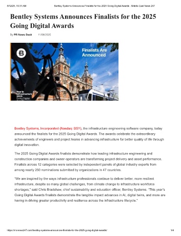 8/12/25, 10:31 AM Bentley Systems Announces Finalists for the 2025 Going Digital Awards - Middle East News 247