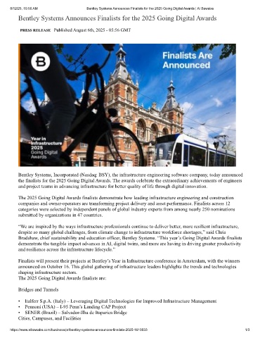 8/12/25, 10:56 AM Bentley Systems Announces Finalists for the 2025 Going Digital Awards | Al Bawaba