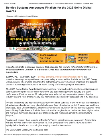 8/12/25, 10:57 AM Bentley Systems Announces Finalists for the 2025 Going Digital Awards - Construction & Property News