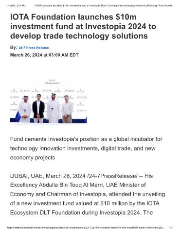 4/12/24, 2:40 PM IOTA Foundation launches $10m investment fund at Investopia 2024 to develop trade technology solutions | Pittsburgh Post-Gazette
