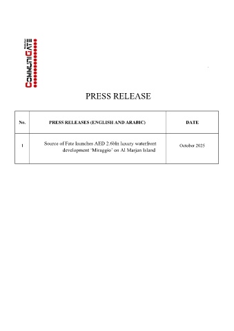 . PRESS RELEASE No. PRESS RELEASES (ENGLISH AND ARABIC) DATE 1 Source of Fate launches AED 2.6bln luxury waterfront October 2025 development ‘Miraggio’ on Al Marjan Island