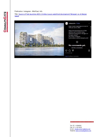 Publication: Instagram - Mid-East. Info Title: Source of Fate launches AED 2.6 billion luxury waterfront development ‘Miraggio’ on Al Marjan Island Tel: 971 4 4546093 Fax: 971 4 3612432 E-mail: info@communigateme.com Website: www.communigateme.com