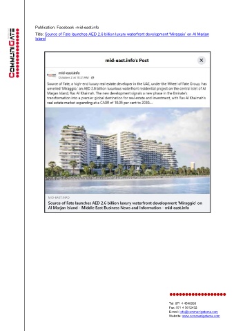 Publication: Facebook -mid-east.info Title: Source of Fate launches AED 2.6 billion luxury waterfront development ‘Miraggio’ on Al Marjan Island Tel: 971 4 4546093 Fax: 971 4 3612432 E-mail: info@communigateme.com Website: www.communigateme.com