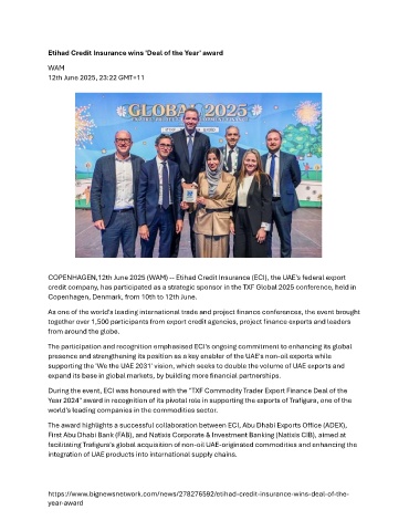 COPENHAGEN,12th June 2025 (WAM) -- Etihad Credit Insurance (ECI), the UAE's federal export